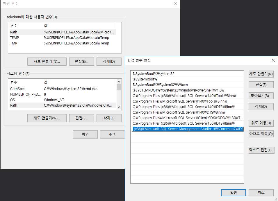- 시스템 환경 변수에 ssms.exe파일이 위치하고 있는 경로를 추가해줌으로써 해결이 가능하다.
